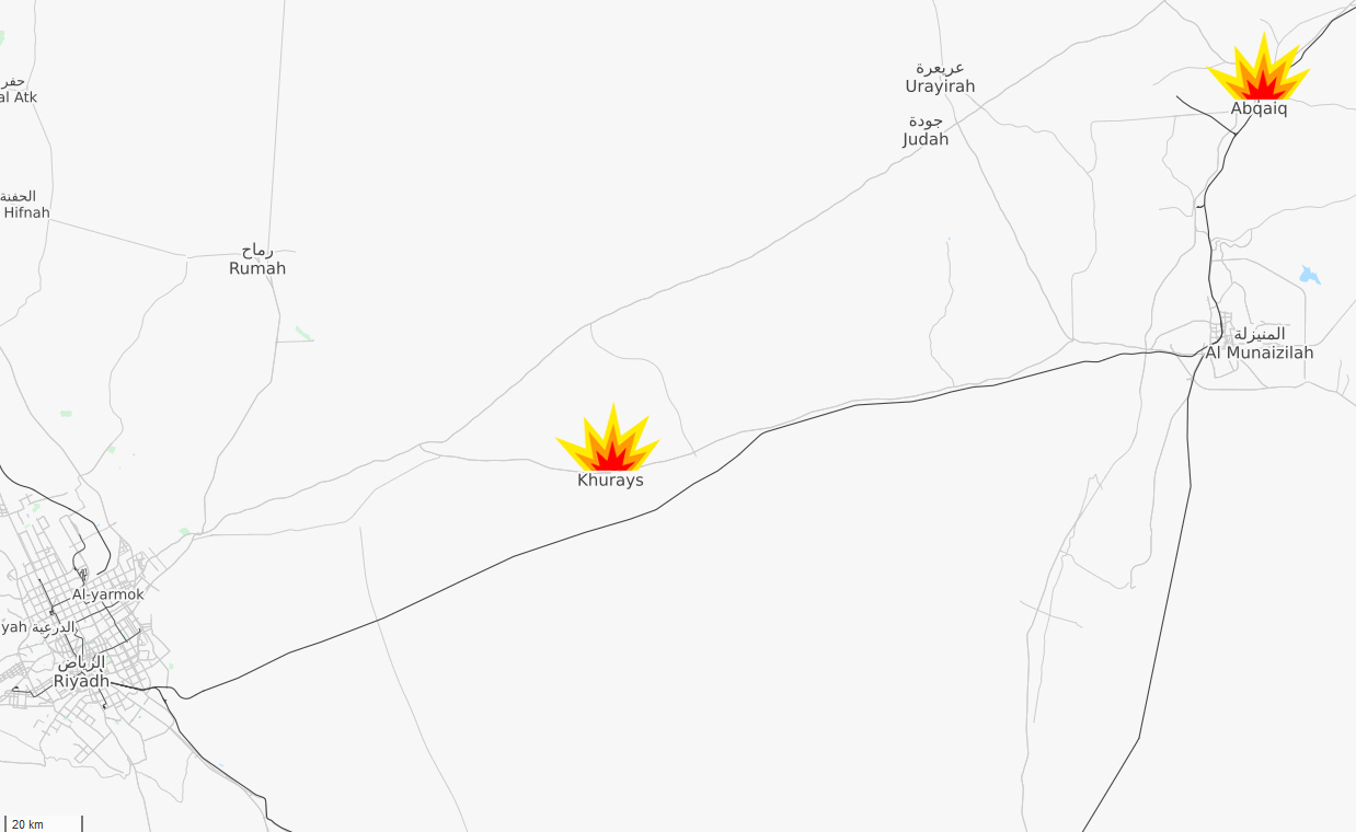 Flere droner blev natten til lørdag sat ind i et angreb mod to vigtige olieanlæg i henholdsvis Abqaiq og Khurais i Saudi Arabien.